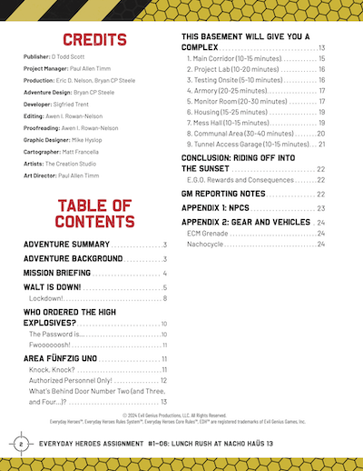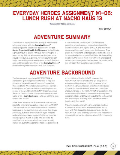 Assignment 06: Lunch Rush at Nacho Haüs 13 is an E.G.O. metaplot Assignment adventure for levels 1-4 heroes.*